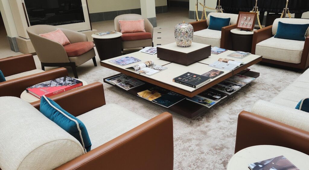 Wrought iron can also be found throughout the hotel in more familiar forms. For example, to the left of the main entrance, the gate leading to the garden is crafted from wrought iron and adorned with birds, evoking a doorway to paradise and mirroring motifs that can be found in the large table on the second-floor corridor and the Persian rug beneath it. The guest room balconies and spiral staircase railings are also made using this traditional technique, with each iron rod hammered, bent, and shaped by hand to create a distinctive texture and classic design.